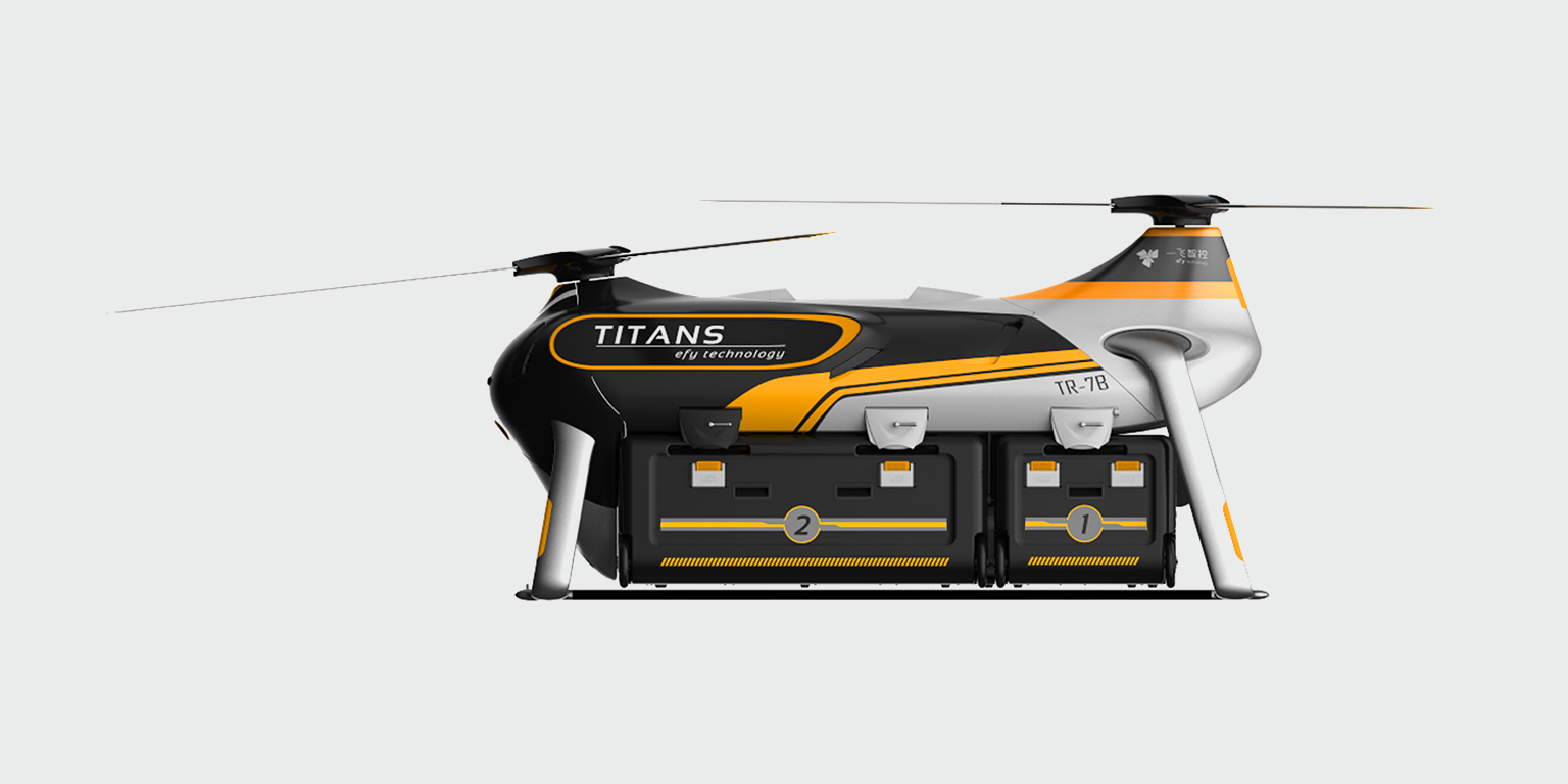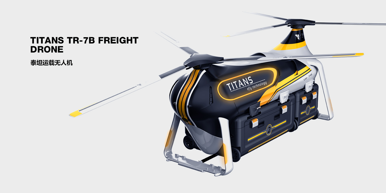 吨级起重的超大无人机。在满足无人机飞行技术的情况下,设计团队赋予了泰坦极强的视觉冲击力,将力量感,